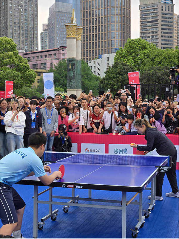 活动现场,筑城广场布设100 张乒乓球台,打造 “百台千人赛” 特色赛事,参赛选手年龄跨度从 7 岁孩童到 77 岁长者,不同年龄、不同职业的乒乓球爱好者同场切磋、以球会友,尽显全民健身的蓬勃活力,传递国球魅力与中华体育精神。启动仪式上,《阿妹戚托》《踩鼓舞》等贵州原生态民族舞蹈、《南明印象・瑞银鸟非遗秀》等特色节目轮番上演,将贵州非遗文化、民族风情与乒乓球运动完美结合,展现了爽爽贵阳的独特城市魅力。国际乒联主席佩特拉・索林、中国乒协主席王励勤携国家队教练员、运动员专程发来祝福视频,为活动增添国际色彩与专业分量。
